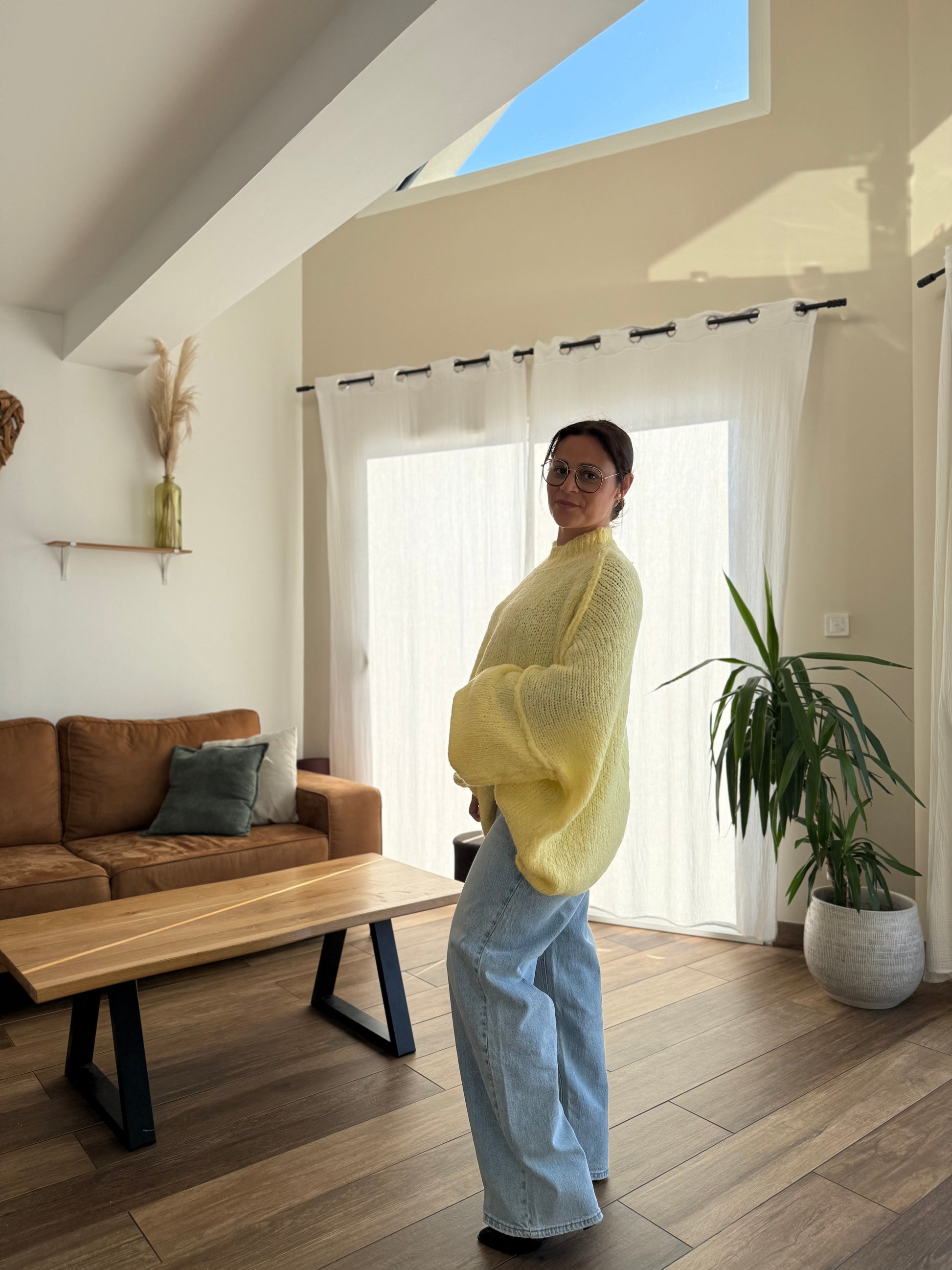 Apportez une touche lumineuse à votre dressing avec ce pull oversize jaune au col cheminée élégant.